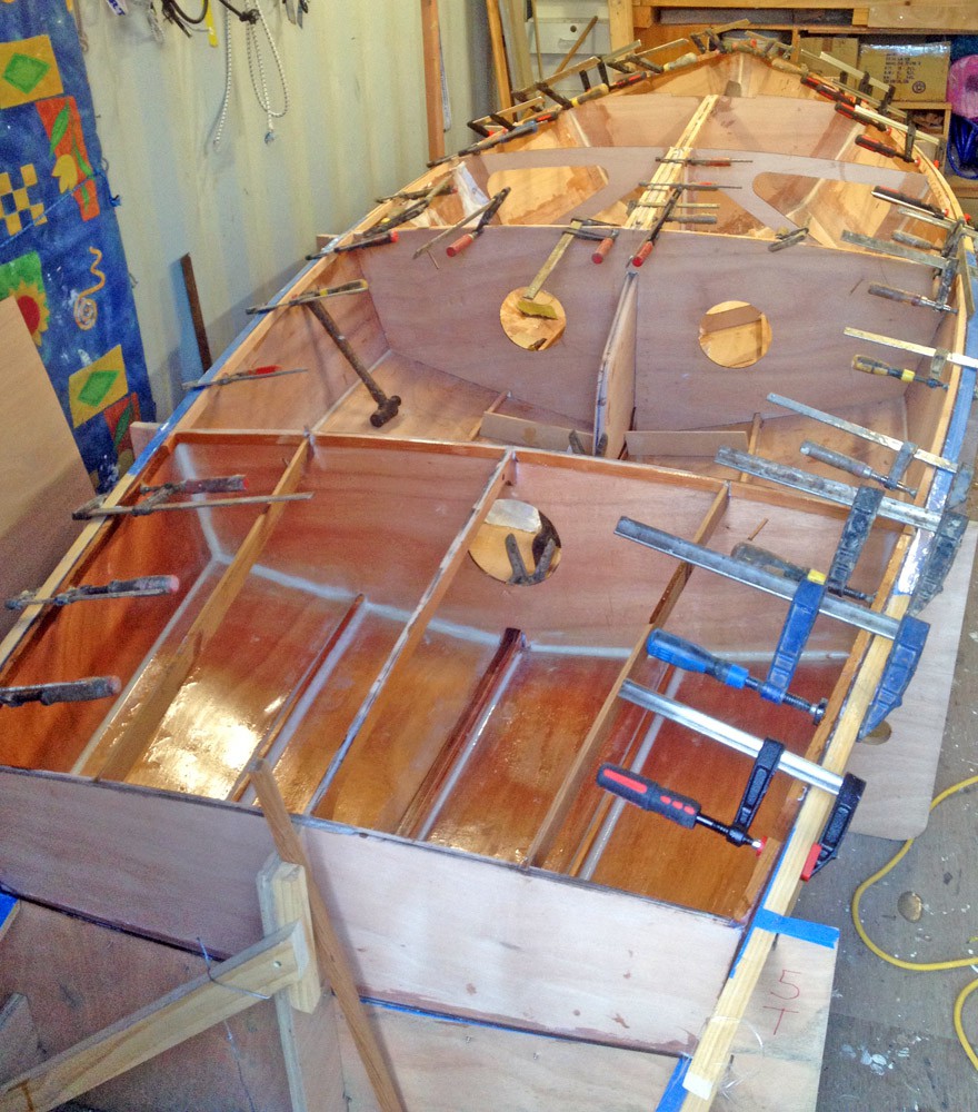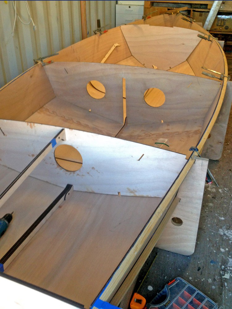 “Dan was fully into the concept so he flew up to Wellington to help build the first boat. It was really hard case. He arrived at 10.30 am on a Friday and we had pre-glued all the panels together so all the components were there waiting and Dan, Luke and myself went for it. Steve turned up after work and Steve’s Dad Jamie turned up and became the runner, zooming round getting bits and pieces as we needed them as we didn't know what was needed until it was needed. By 2.30 pm on the Saturday the first boat was ready for the deck to go on. At one stage there were 13 people watching us work and plenty of beer bottles stacked on the workbench. It was great fun building the first one together, a bit like the old days when projects like this happened. Steve’s was the first boat, then we built Luke’s boat and mine came a little while after, but we all helped build one another’s boats, which was really cool.”
