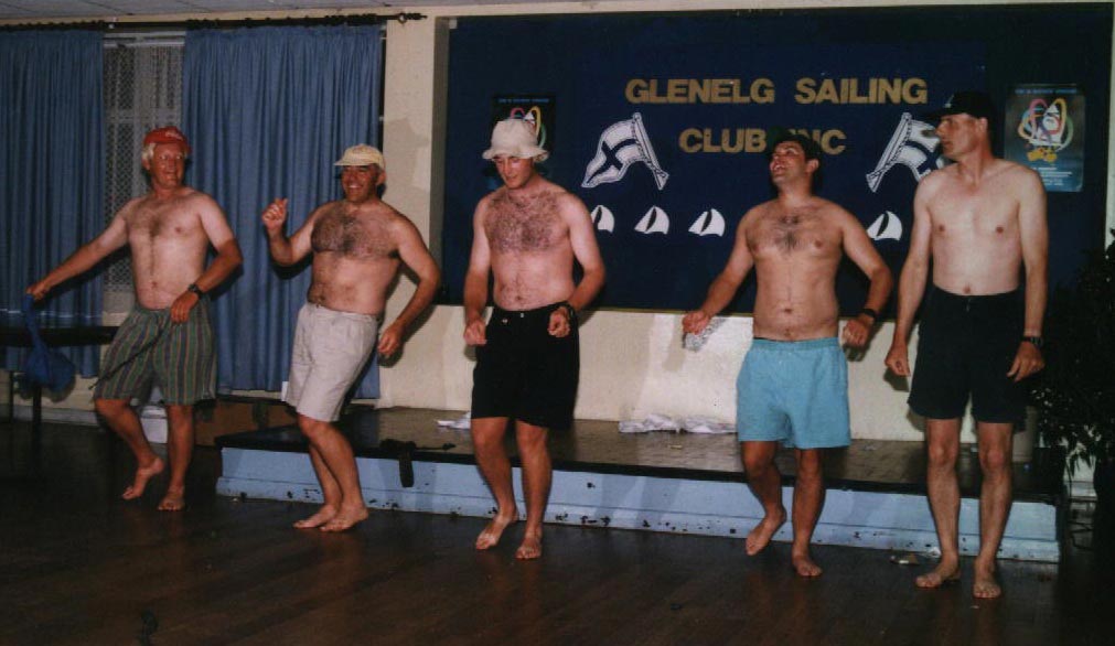 Headley Fletcher, Ken Carroll, David Carroll, Terry Curtis and David Rose showing of their tan lines ... (86K)